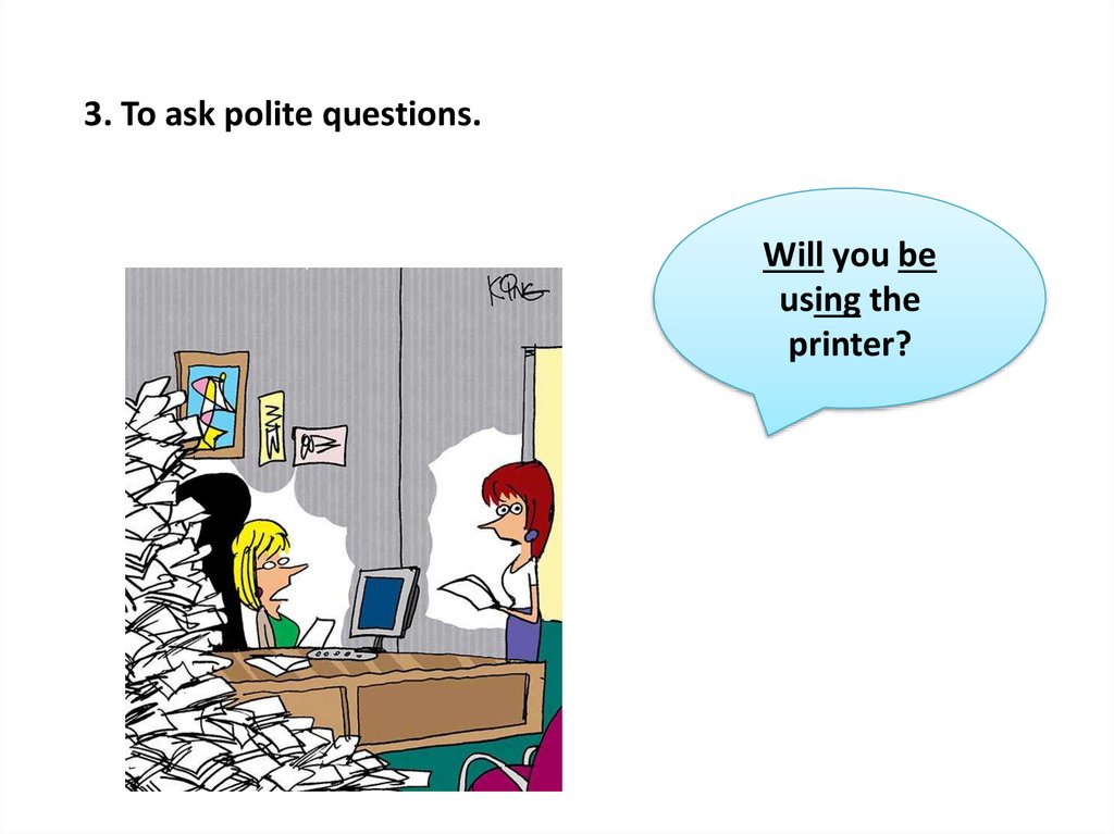 3. To ask polite questions.Will you be