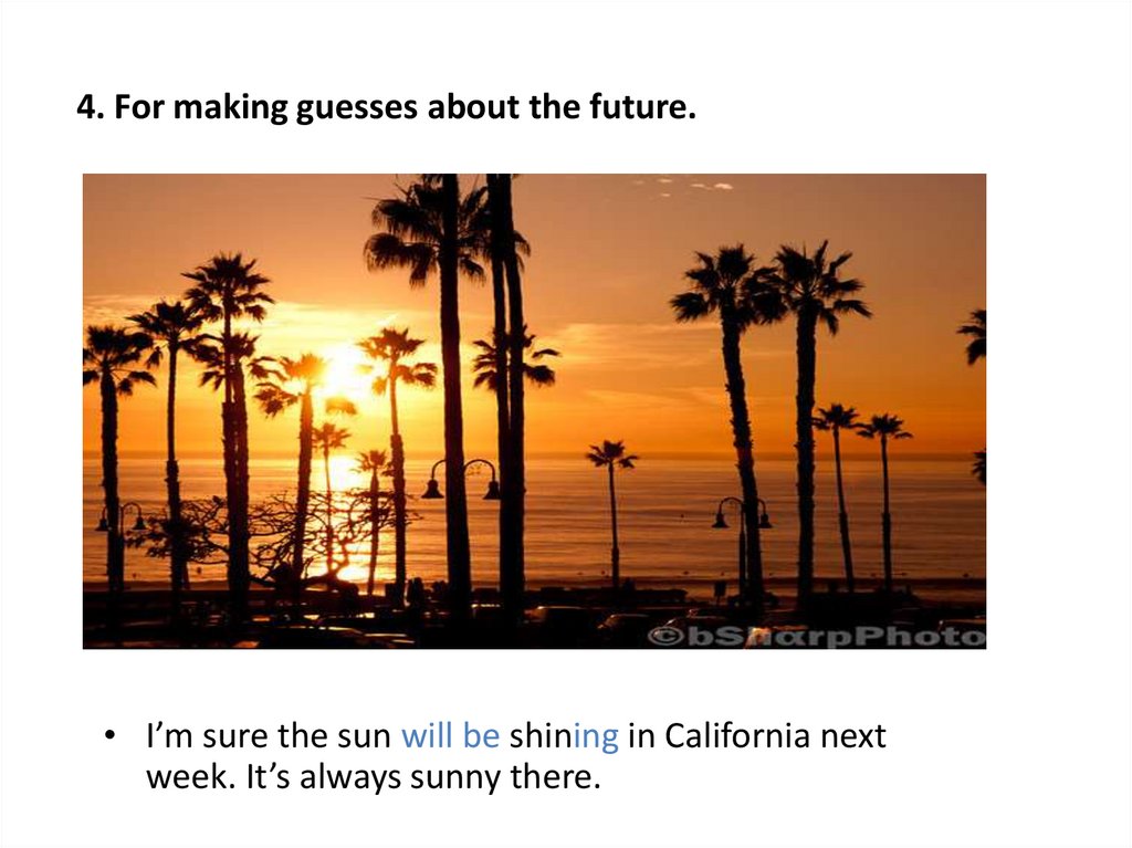 4. For making guesses about the future.• I’m sure the sun will be shining in California next