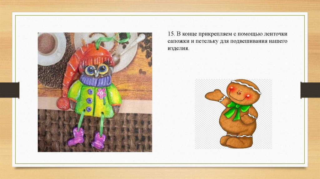15. В конце прикрепляем с помощью ленточкисапожки и петельку для подвешивания нашего