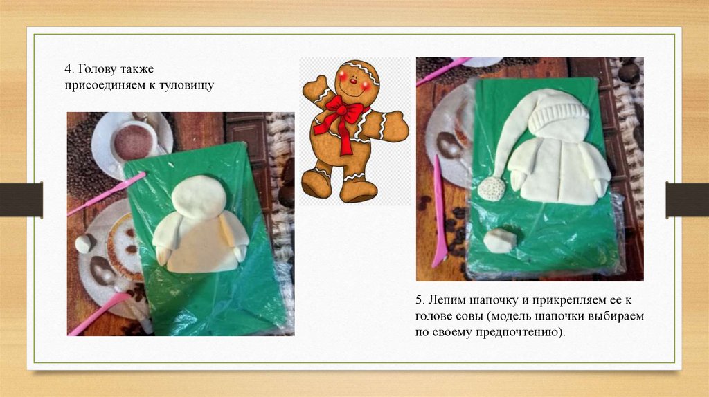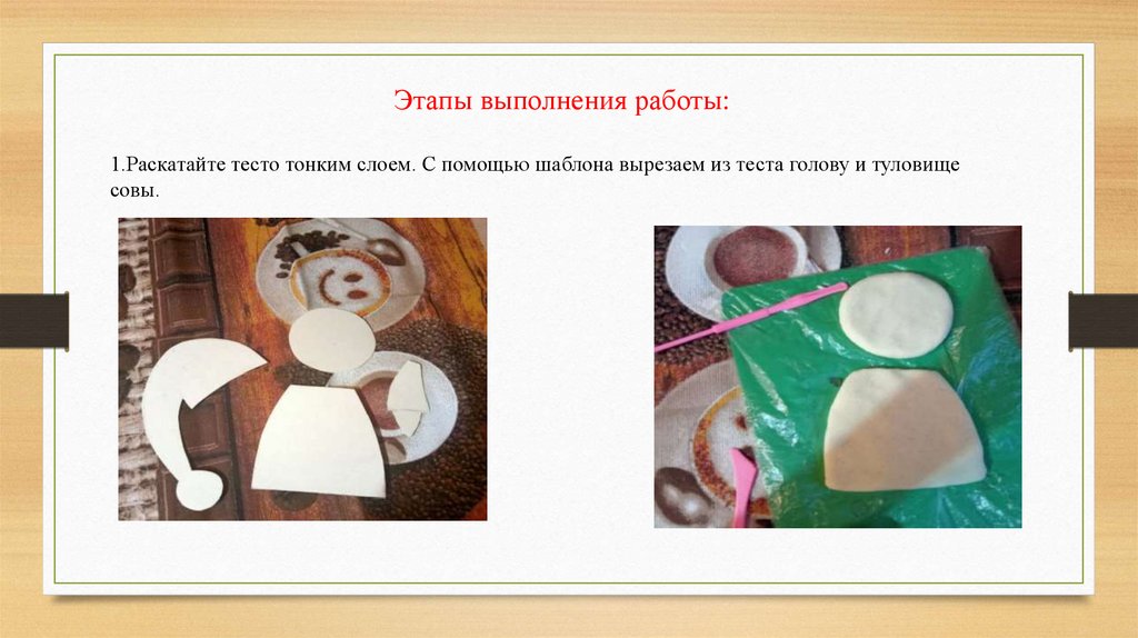 Этапы выполнения работы:1.Раскатайте тесто тонким слоем. С помощью шаблона вырезаем из теста голову и туловище