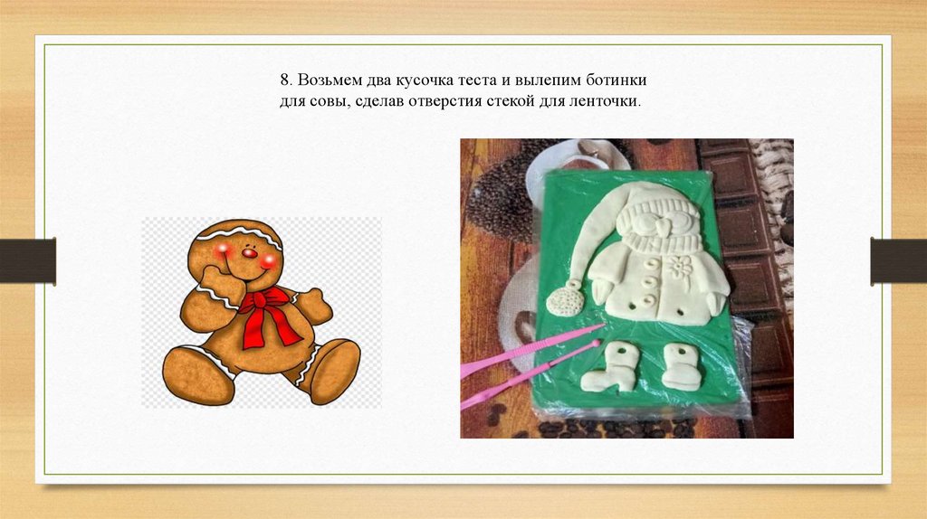 8. Возьмем два кусочка теста и вылепим ботинкидля совы, сделав отверстия стекой для ленточки.