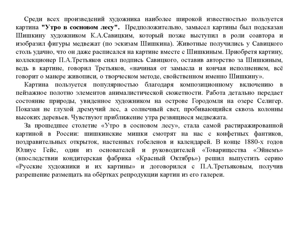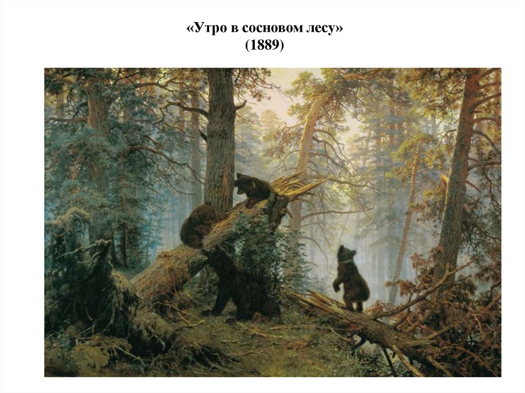 Среди всех произведений художника наиболее широкой известностью пользуетсякартина "Утро в сосновом лесу". Предположительно, замысел картины был подсказан
