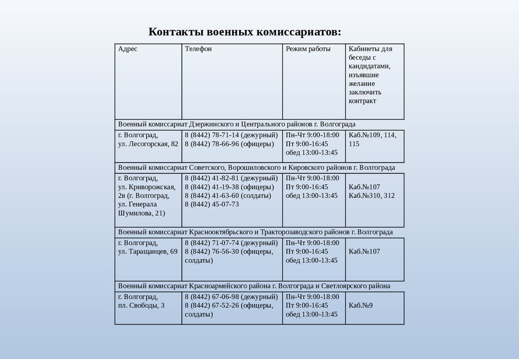 Контакты военных комиссариатов:Адрес
