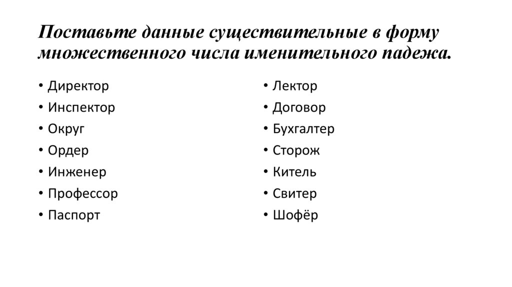 Поставьте данные существительные в формумножественного числа именительного падежа.