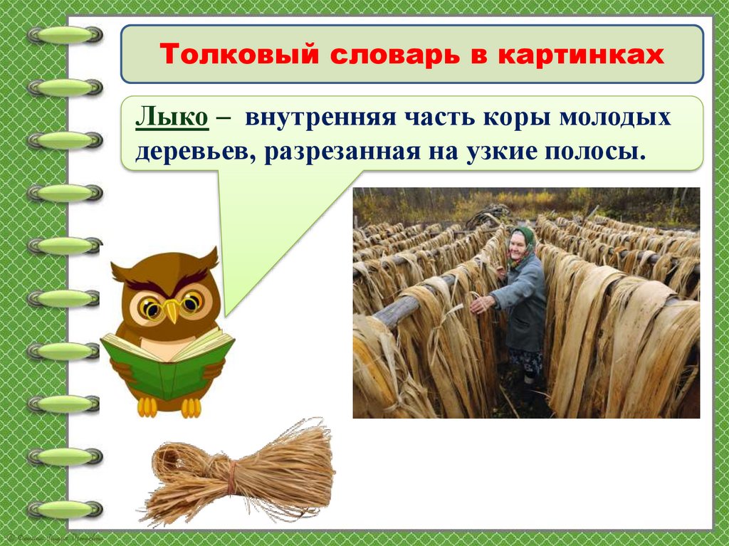 Толковый словарь в картинкахЛыко – внутренняя часть коры молодых