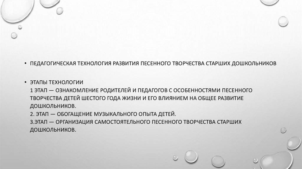 • ПЕДАГОГИЧЕСКАЯ ТЕХНОЛОГИЯ РАЗВИТИЯ ПЕСЕННОГО ТВОРЧЕСТВА СТАРШИХ ДОШКОЛЬНИКОВ• ЭТАПЫ ТЕХНОЛОГИИ