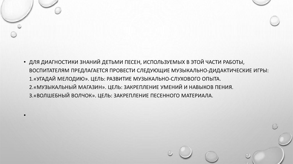 • ДЛЯ ДИАГНОСТИКИ ЗНАНИЙ ДЕТЬМИ ПЕСЕН, ИСПОЛЬЗУЕМЫХ В ЭТОЙ ЧАСТИ РАБОТЫ,ВОСПИТАТЕЛЯМ ПРЕДЛАГАЕТСЯ ПРОВЕСТИ СЛЕДУЮЩИЕ МУЗЫКАЛЬНО-ДИДАКТИЧЕСКИЕ ИГРЫ: