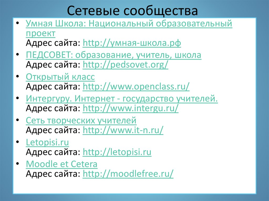 Сетевые сообщества• Умная Школа: Национальный образовательный