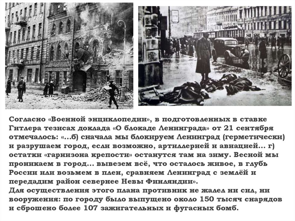 Согласно «Военной энциклопедии», в подготовленных в ставкеГитлера тезисах доклада «О блокаде Ленинграда» от 21 сентября