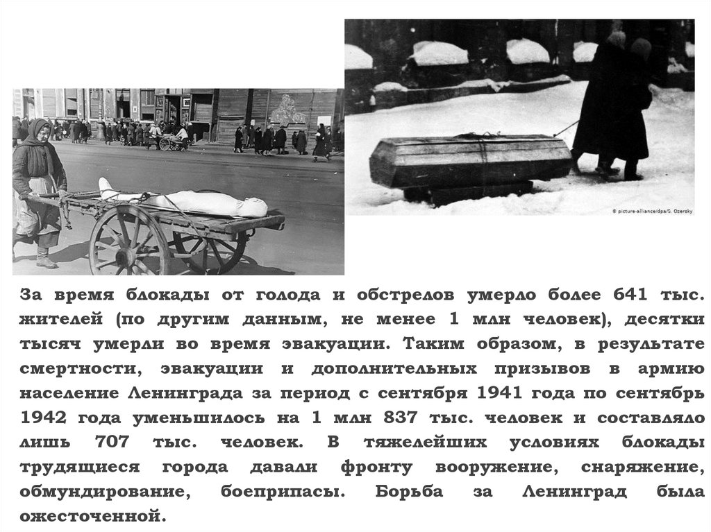 За время блокады от голода и обстрелов умерло более 641 тыс.жителей (по другим данным, не менее 1 млн человек), десятки