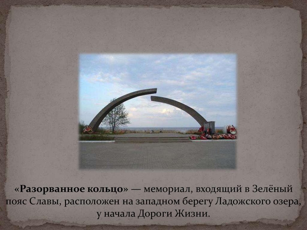 «Разорванное кольцо» — мемориал, входящий в Зелёныйпояс Славы, расположен на западном берегу Ладожского озера,
