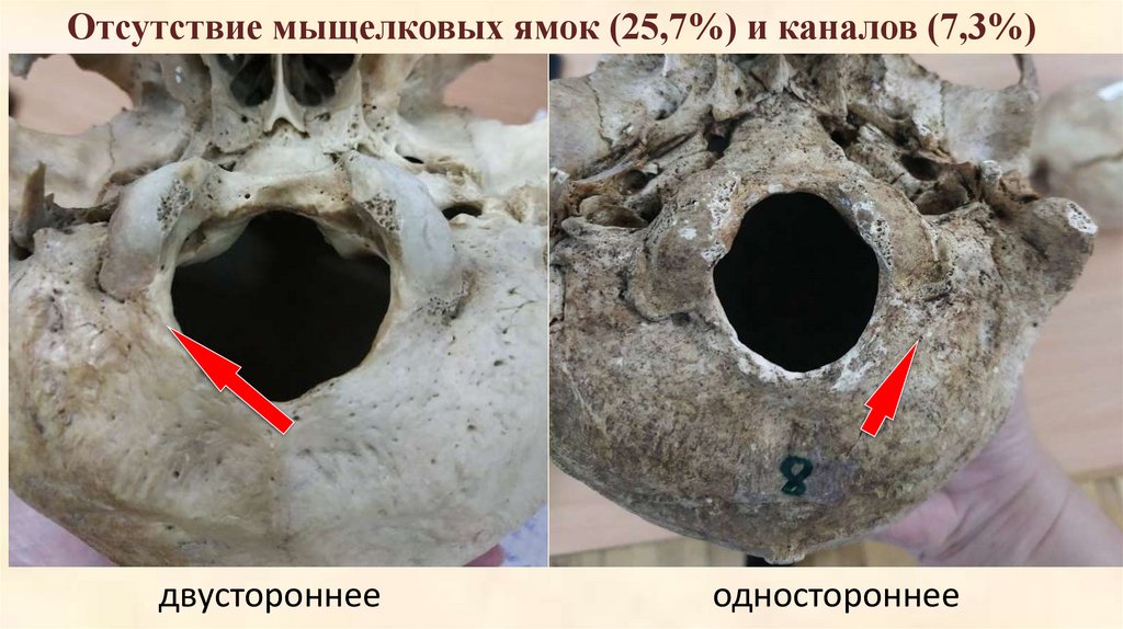 Отсутствие мыщелковых ямок (25,7%) и каналов (7,3%)двустороннее