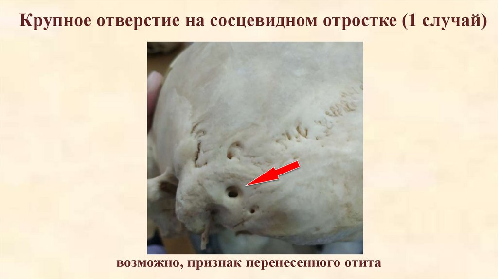 Крупное отверстие на сосцевидном отростке (1 случай)возможно, признак перенесенного отита