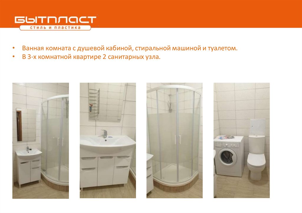 • Ванная комната с душевой кабиной, стиральной машиной и туалетом.• В 3-х комнатной квартире 2 санитарных узла.