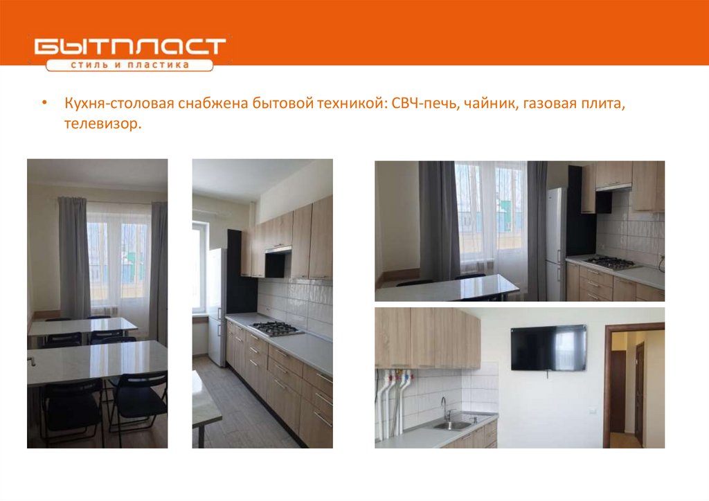 • Кухня-столовая снабжена бытовой техникой: СВЧ-печь, чайник, газовая плита,телевизор.