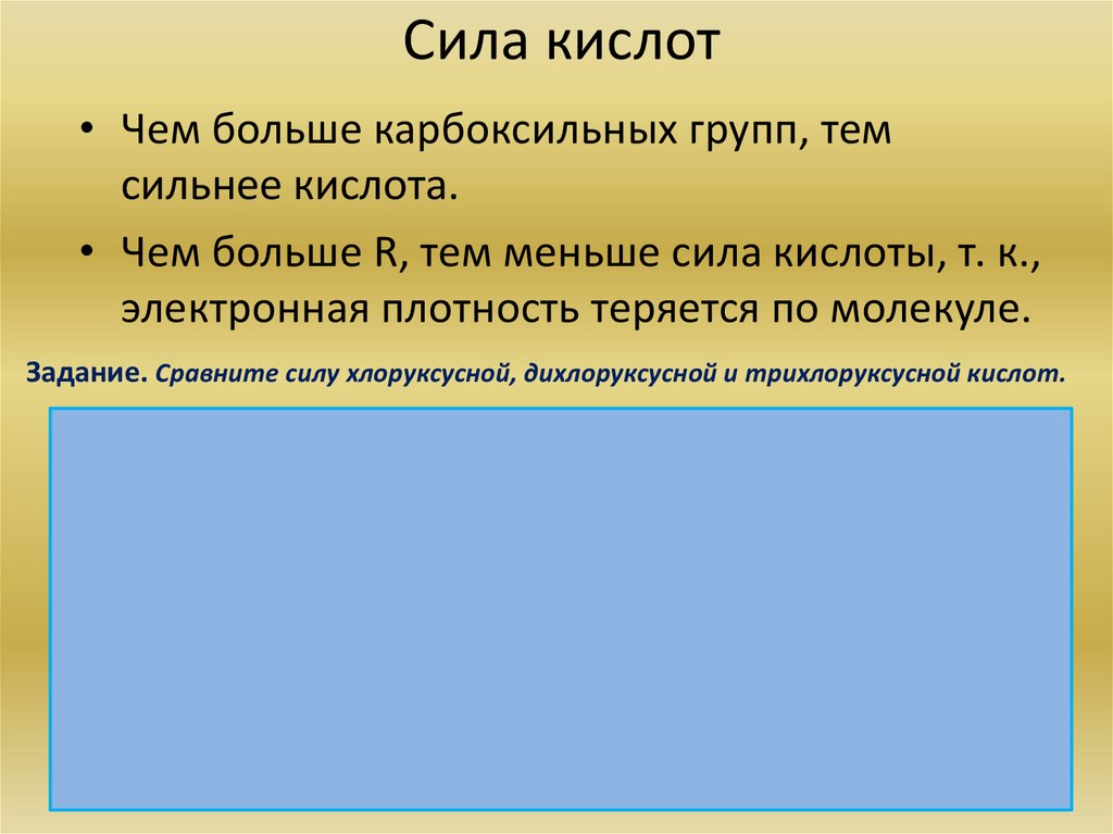 Задание. Сравните силу хлоруксусной, дихлоруксусной и трихлоруксусной кислот.