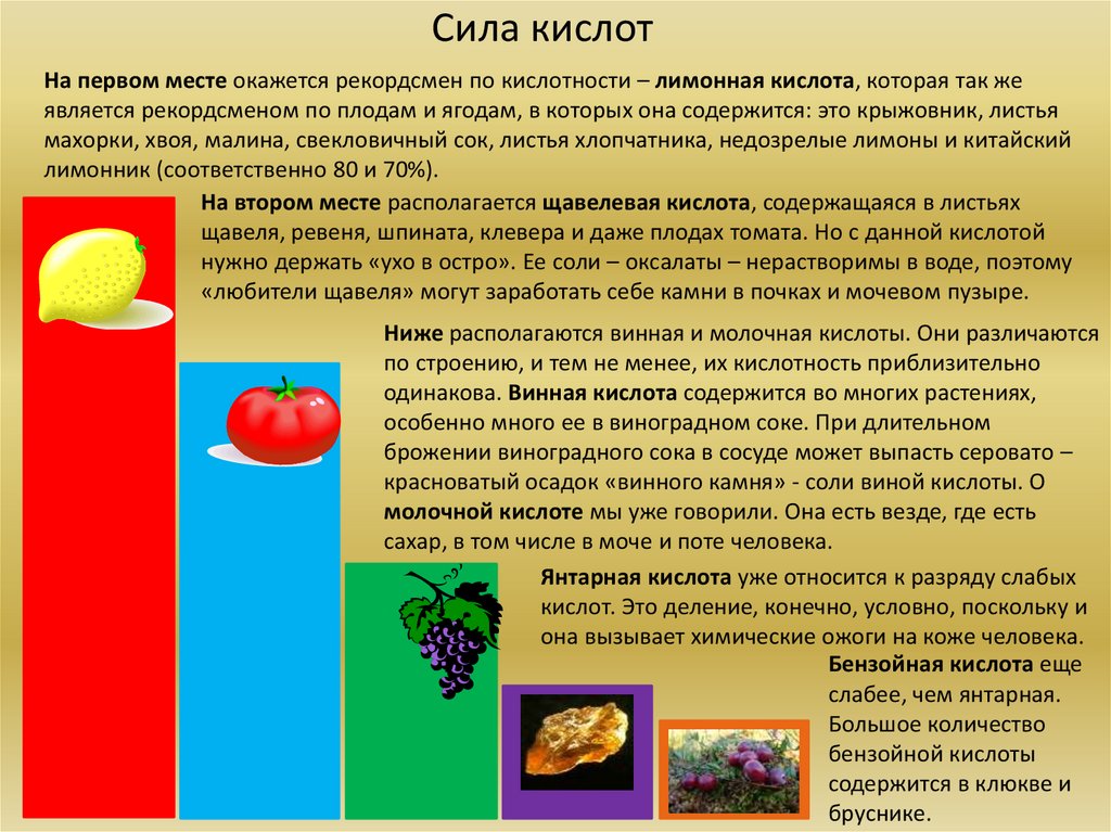 Сила кислотНа первом месте окажется рекордсмен по кислотности – лимонная кислота, которая так же