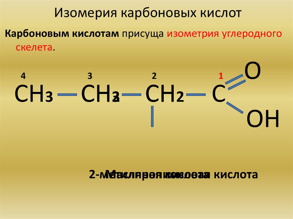 Изомерия карбоновых кислотКарбоновым кислотам присуща изометрия углеродного