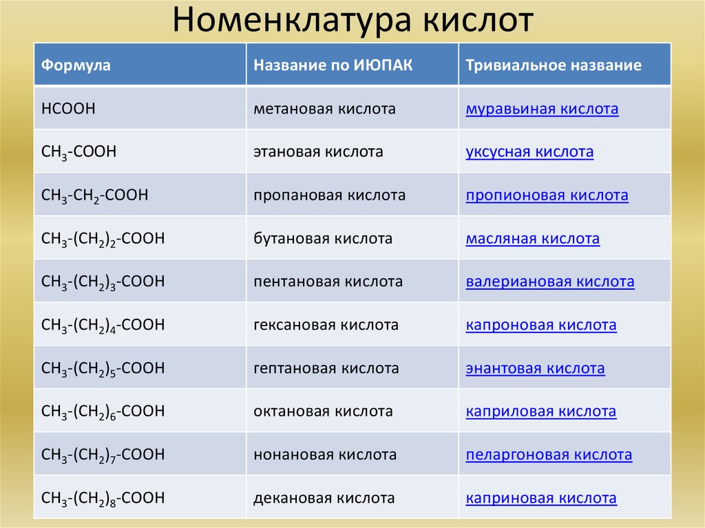 Номенклатура кислотФормула