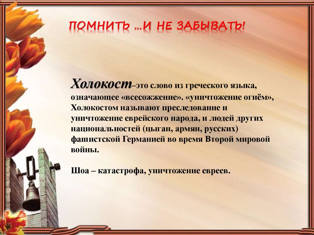 ПОМНИТЬ …И НЕ ЗАБЫВАТЬ!Холокост–это слово из греческого языка,