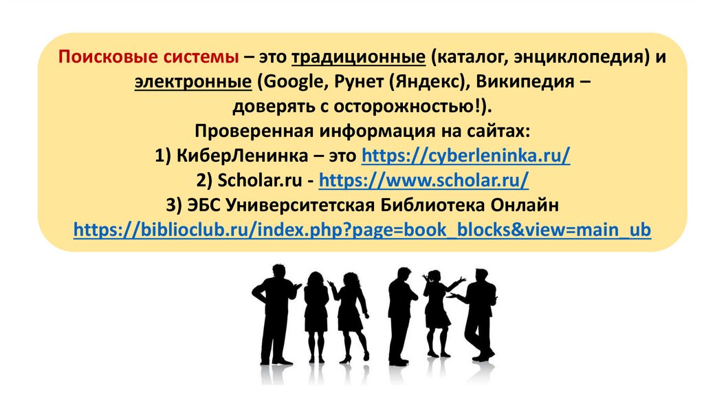 Поисковые системы – это традиционные (каталог, энциклопедия) иэлектронные (Google, Рунет (Яндекс), Википедия –