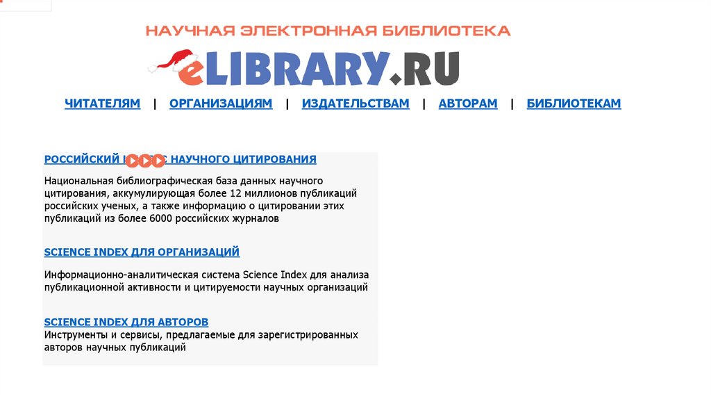 ЧИТАТЕЛЯМ | ОРГАНИЗАЦИЯМ | ИЗДАТЕЛЬСТВАМ | АВТОРАМ | БИБЛИОТЕКАМРОССИЙСКИЙ ИНДЕКС НАУЧНОГО ЦИТИРОВАНИЯ