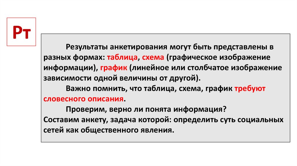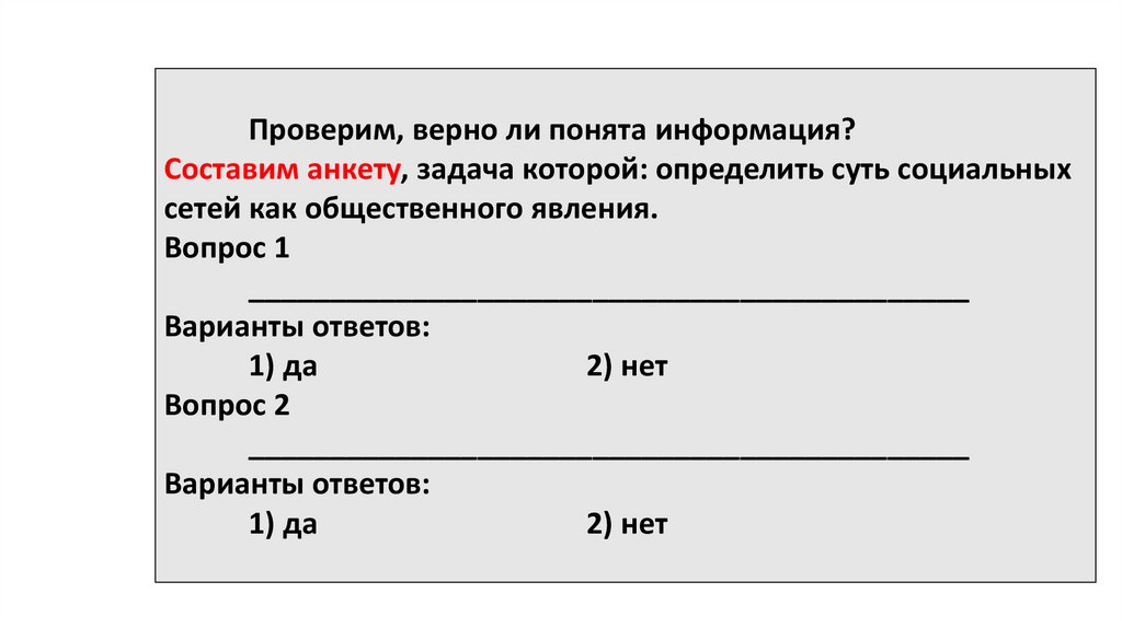 Проверим, верно ли понята информация?Составим анкету, задача которой: определить суть социальных