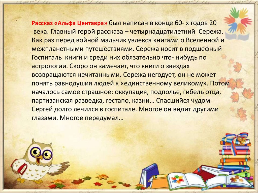 Рассказ «Альфа Центавра» был написан в конце 60- х годов 20века. Главный герой рассказа – четырнадцатилетний Сережа.