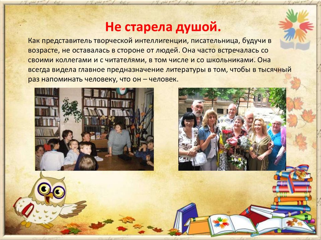 Не старела душой.Как представитель творческой интеллигенции, писательница, будучи в