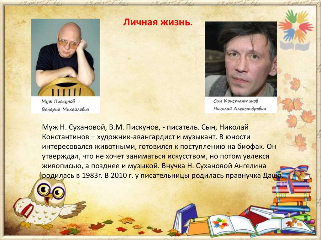 Личная жизнь.Муж Н. Сухановой, В.М. Пискунов, - писатель. Сын, Николай