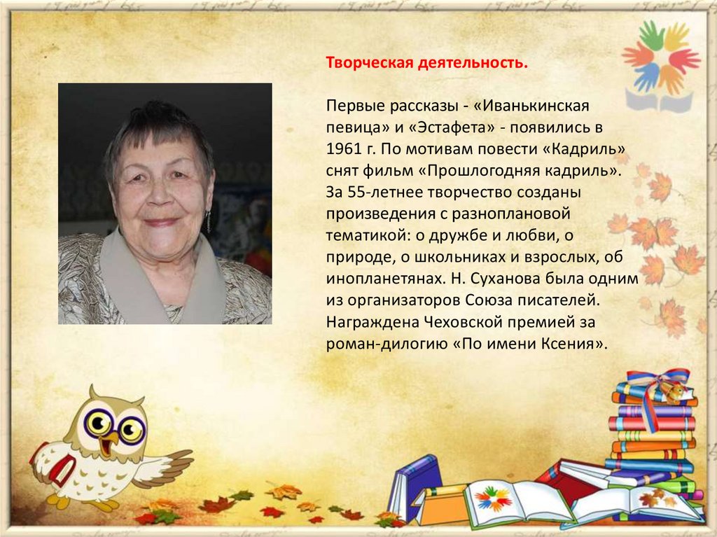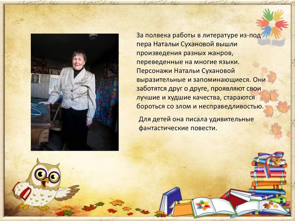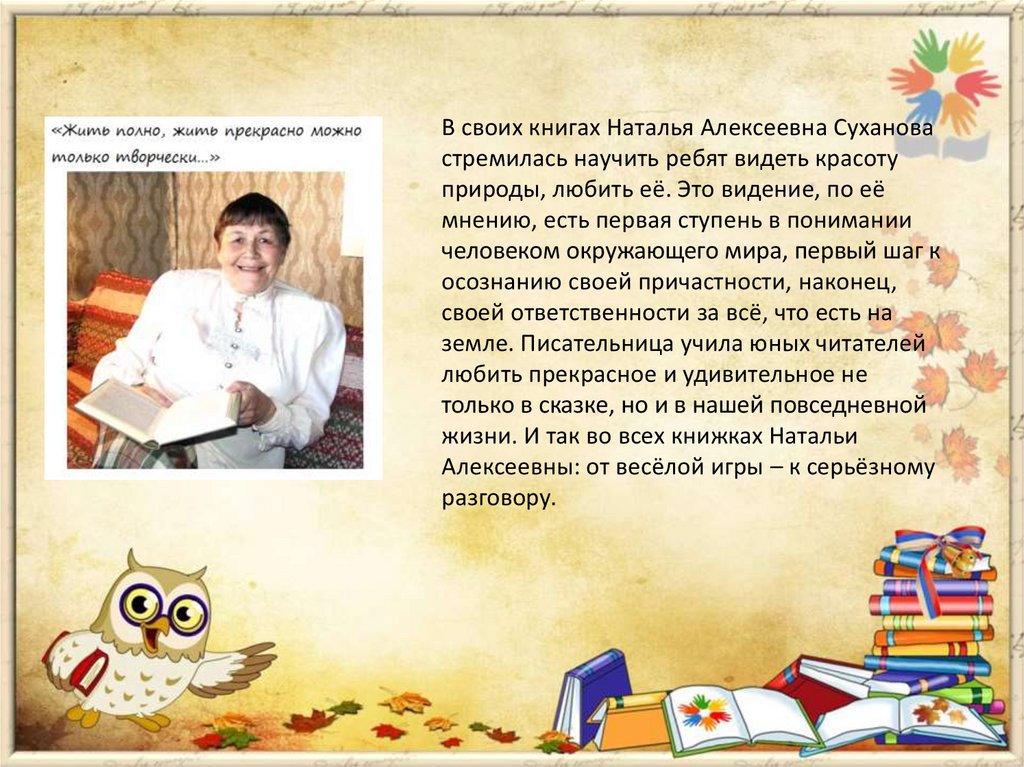 В своих книгах Наталья Алексеевна Сухановастремилась научить ребят видеть красоту