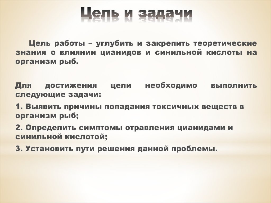 Цель работы – углубить и закрепить теоретическиезнания о влиянии цианидов и синильной кислоты на