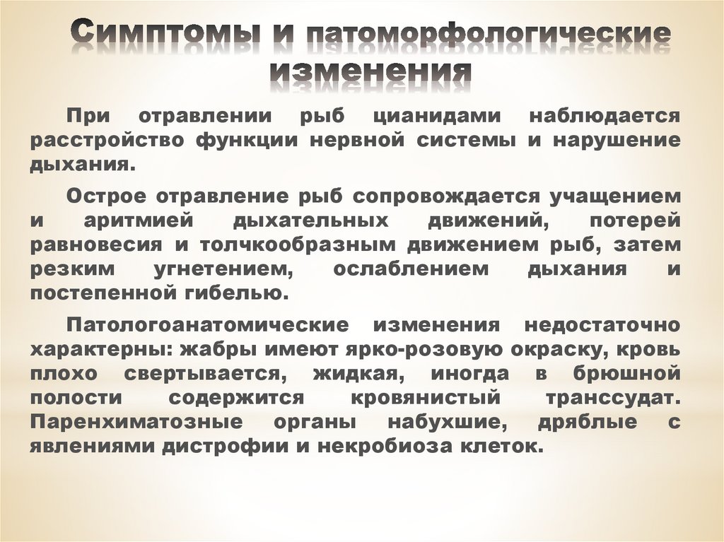 При отравлении рыб цианидами наблюдаетсярасстройство функции нервной системы и нарушение