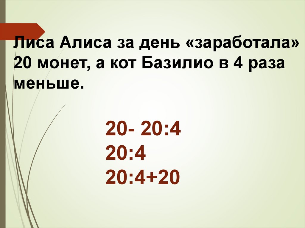 Лиса Алиса за день «заработала»20 монет, а кот Базилио в 4 раза