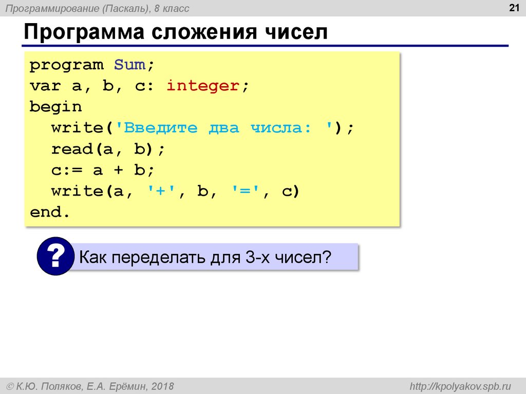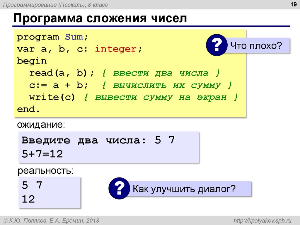 c:= a + b; { вычислить их сумму }