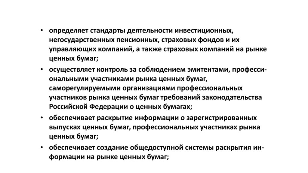 • определяет стандарты деятельности инвестиционных,негосударственных пенсионных, страховых фондов и их