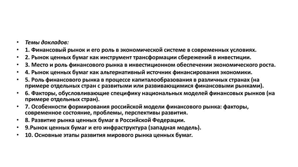 Темы докладов:1. Государственная политика на рынке ценных бумаг, ее цели и основные