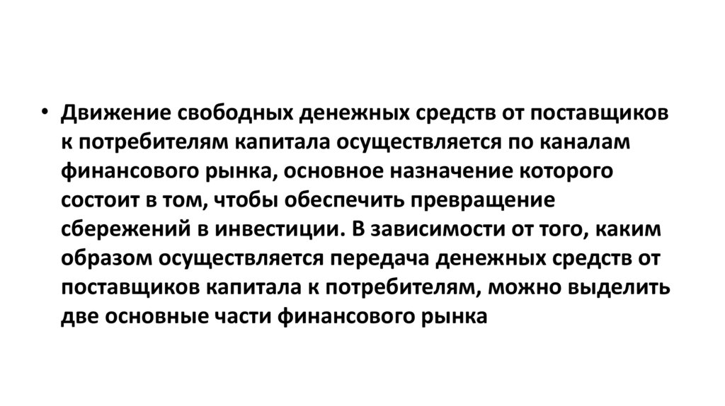 • Движение свободных денежных средств от поставщиковк потребителям капитала осуществляется по каналам