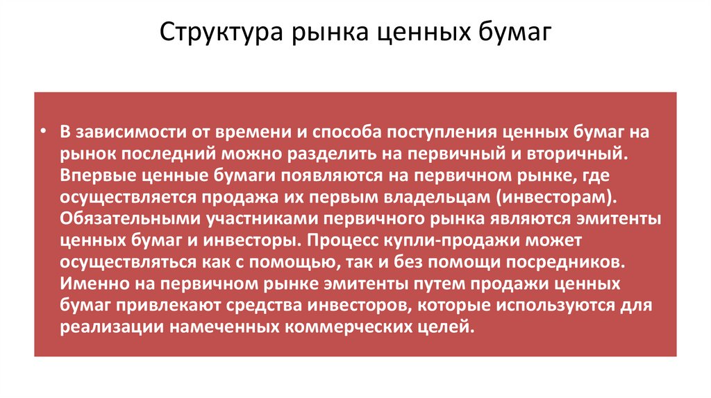 Структура рынка ценных бумаг• В зависимости от времени и способа поступления ценных бумаг на