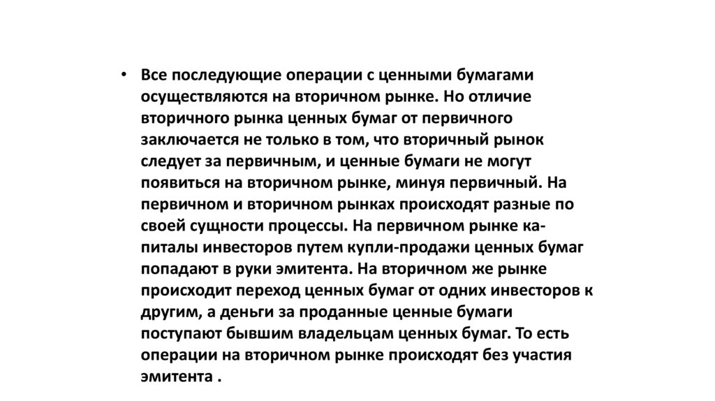 • Все последующие операции с ценными бумагамиосуществляются на вторичном рынке. Но отличие