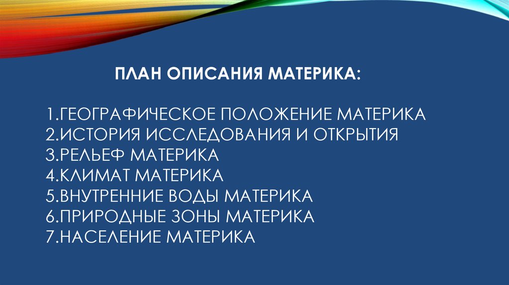 ПЛАН ОПИСАНИЯ МАТЕРИКА:1.ГЕОГРАФИЧЕСКОЕ ПОЛОЖЕНИЕ МАТЕРИКА