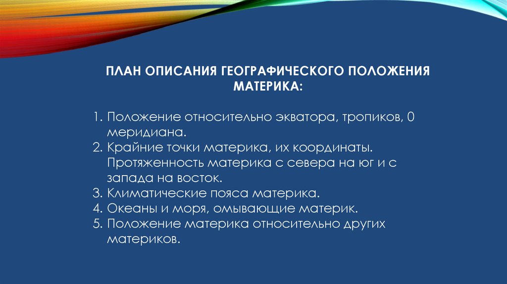 ПЛАН ОПИСАНИЯ ГЕОГРАФИЧЕСКОГО ПОЛОЖЕНИЯМАТЕРИКА: