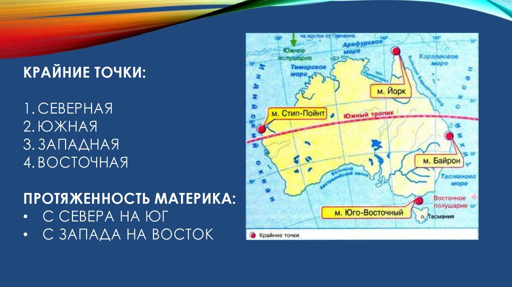 2. Крайние точки материка, их координаты.