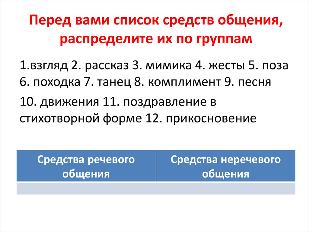 Перед вами список средств общения,распределите их по группам