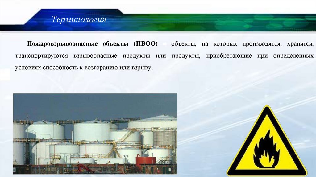 ТерминологияПожаровзрывоопасные объекты (ПВОО) – объекты, на которых производятся, хранятся,