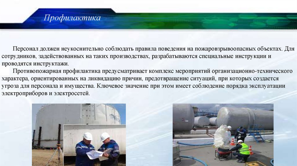 ПрофилактикаПерсонал должен неукоснительно соблюдать правила поведения на пожаровзрывоопасных объектах. Для