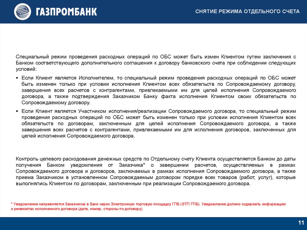 СНЯТИЕ РЕЖИМА ОТДЕЛЬНОГО СЧЕТАСпециальный режим проведения расходных операций по ОБС может быть измен Клиентом путем заключения с