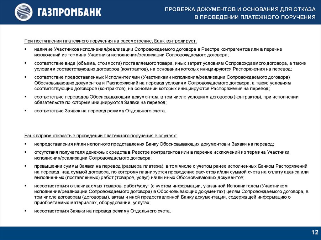 ПРОВЕРКА ДОКУМЕНТОВ И ОСНОВАНИЯ ДЛЯ ОТКАЗАВ ПРОВЕДЕНИИ ПЛАТЕЖНОГО ПОРУЧЕНИЯ