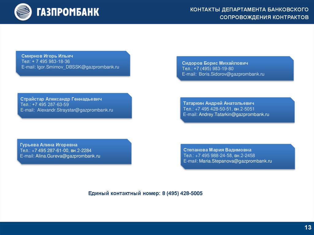 КОНТАКТЫ ДЕПАРТАМЕНТА БАНКОВСКОГОСОПРОВОЖДЕНИЯ КОНТРАКТОВ