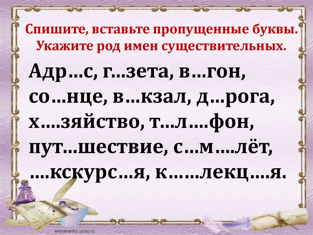 Спишите, вставьте пропущенные буквы.Укажите род имен существительных.